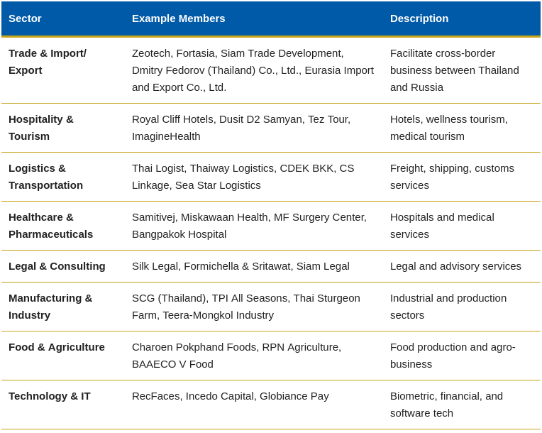 The TRCC demonstrates a balanced and dynamic membership — combining leading Thai conglomerates, Russian tech and trade companies, and individual professionals.